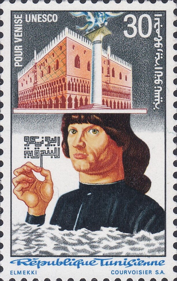 يسلط هذا الطابع الضوء على الهندسة المعمارية الضخمة لمدينة البندقية كرمز للتراث الفني العالمي المهدد، من خلال ربط مبنى رمزي بتركيبة تستحضر ارتفاع المياه. يسلط الرسم التوضيحي الضوء على قابلية تعرض الكنوز المعمارية للقوى الطبيعية، مع التذكير بقيمتها التاريخية والثقافية التي لا يمكن تعويضها. إن التناقض بين صلابة المبنى وعدم استقرار البيئة المائية يعزز رسالة الإلحاح والمسؤولية الجماعية. وفي السياق التونسي، يعكس هذا الطابع التضامن الثقافي مع المدن التاريخية الكبرى في العالم ويؤكد مكانة تونس في المبادرات الدولية لحماية التراث، وإدراكا لأهمية الحفاظ على ذاكرة الحضارات للأجيال القادمة.