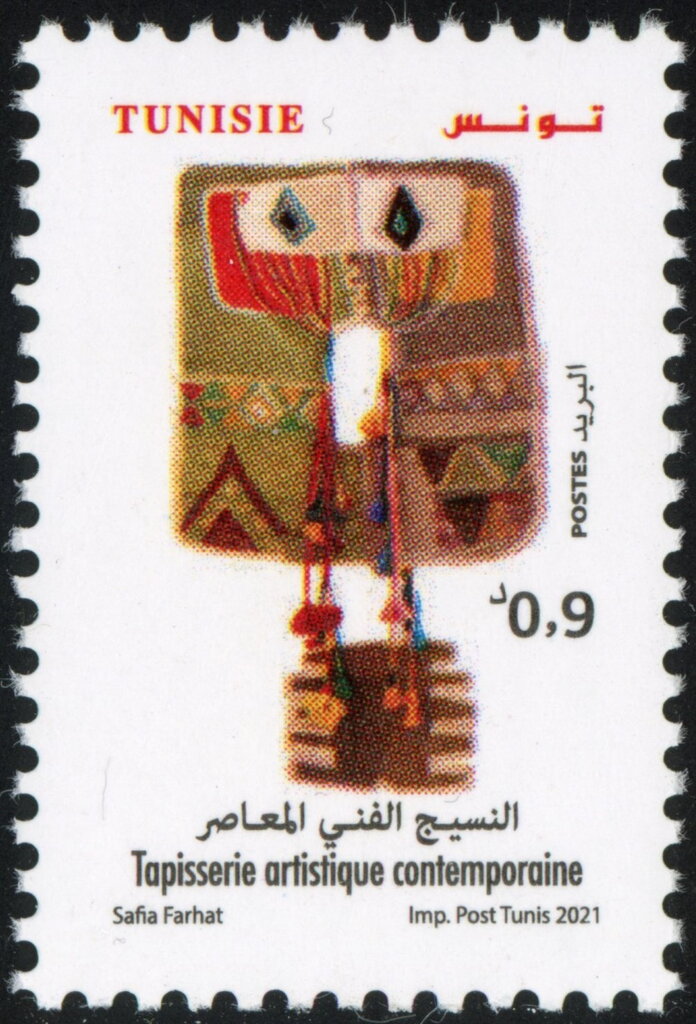 Complétant la série dédiée à l'art du tissage, ce timbre présente une autre œuvre monumentale de Safia Farhat, caractérisée par ses formes géométriques et ses textures riches. L'illustration souligne la dimension architecturale de ses créations qui ornent de nombreux édifices publics en Tunisie. Ce sujet célèbre l'identité artistique tunisienne qui puise sa force dans la réappropriation des matériaux locaux et des motifs berbères ou citadins pour créer un art universel, ancrant ainsi l'artisanat traditionnel dans la modernité esthétique du pays.