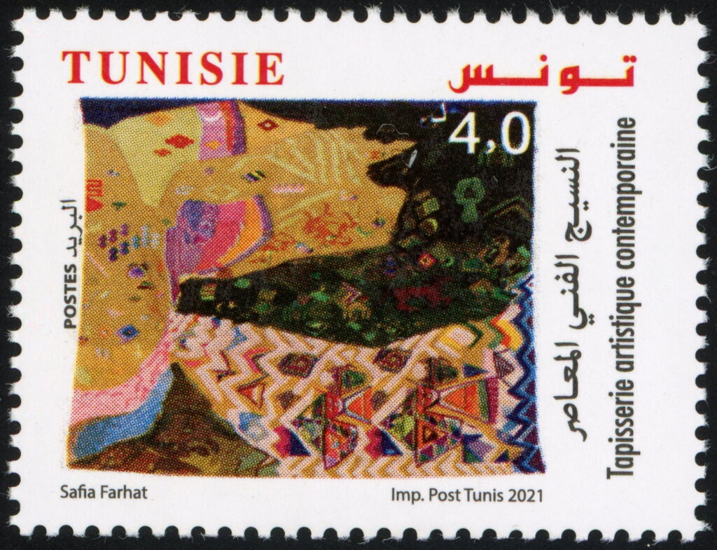 Ce timbre clôture l'hommage à Safia Farhat en présentant une œuvre textile aux contrastes saisissants, mêlant des ocres solaires à des profondeurs sombres. L'illustration met en exergue le travail de texture et la richesse chromatique de l'artiste, qui a su transformer la laine en un support d'expression moderne. Ce sujet célèbre l'héritage d'une femme pionnière qui a décloisonné les arts en Tunisie, élevant le tissage traditionnel au rang de « tapisserie artistique contemporaine » et inscrivant ainsi l'artisanat dans une dynamique de création intellectuelle et académique.