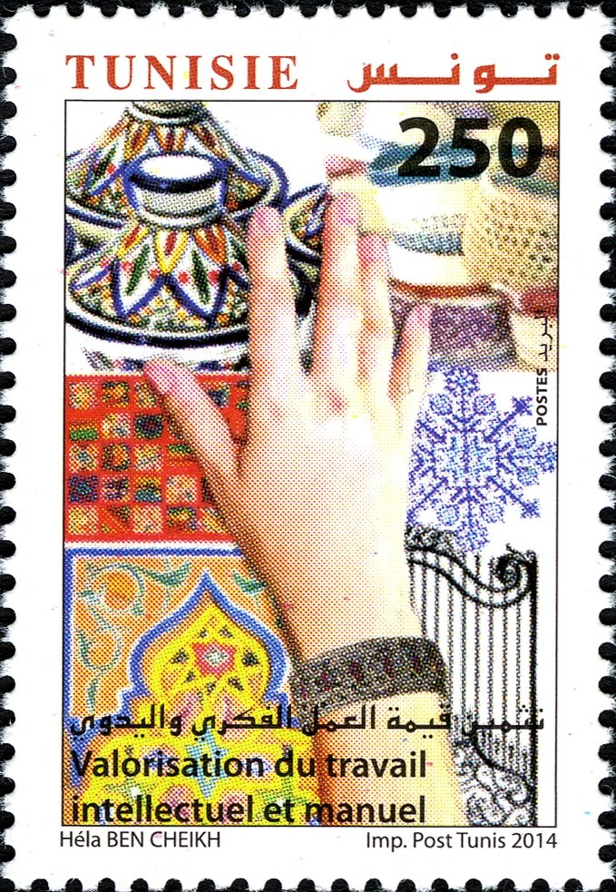 Sous le titre « Valorisation du travail intellectuel et manuel », ce timbre célèbre le savoir-faire traditionnel et l'artisanat tunisien comme piliers de l'économie et de la culture nationale. La composition, créée par l'artiste Héla Ben Cheikh, superpose une main en pleine action à des motifs de poterie vernissée, de tissage de tapis (Klim ou Margoum) et de ferronnerie d'art. La symbolique de la main exalte la transmission des gestes ancestraux et la créativité humaine, rappelant que l'identité tunisienne s'est forgée dans la matière, entre le raffinement des arts décoratifs et la dignité du labeur manuel.